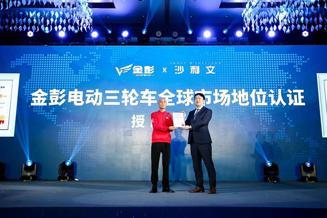 活動當天,國際權威調研機構Frost & Sullivan(弗若斯特沙利文,簡稱“沙利文”)也對金彭電動三輪車的全球市場地位和“金動力”系統在行業的影響力給予高度評價和權威認證。沙利文經過調研并查閱了大量的國內外數據,最終認定金彭電動三輪車自2008年至2020年連續13年全球銷量第一、金動力系統在“同一路段、同等輸出功率”下能夠實現“同一路段,多拉一半”,切實幫助用戶解決拉得少、跑得慢、跑不遠的產品痛點。