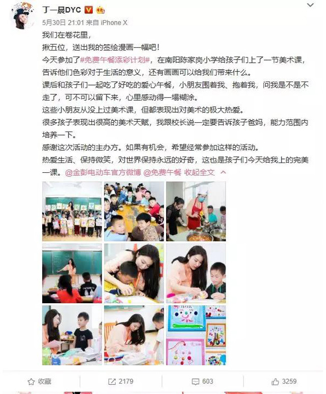 陳家崗小學(xué)的六一“歡樂課堂”從一節(jié)創(chuàng)意手工課開始。知名漫畫家丁一晨與兩位志愿者一起,給孩子帶來各式各樣的手工材料,在老師的指導(dǎo)下,孩子們天馬行空的想象力和動(dòng)手能力被激發(fā),眼花繚亂的材料立刻變成了一幅幅精致的作品呈現(xiàn)在大家面前。“孩子們的創(chuàng)造力很強(qiáng),在這個(gè)過程中,他們展現(xiàn)出的互助、分享和純真等美好品質(zhì)也讓我受益良多。”課間,丁一晨將學(xué)生們上課的情景繪制成了漫畫,用畫筆記錄充滿童趣的一課。活動(dòng)結(jié)束后,丁一晨將孩子們的作品發(fā)布在微博上,單條轉(zhuǎn)發(fā)超2000,評論超600,引起網(wǎng)友熱烈討論。