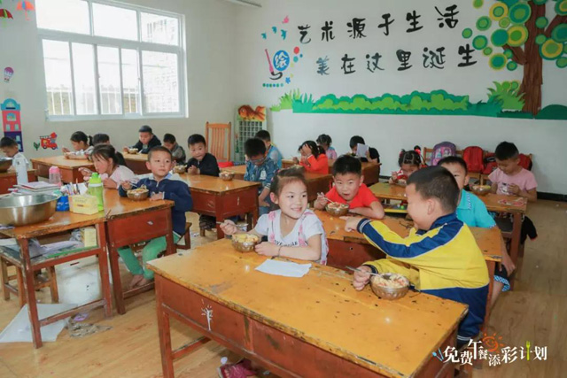 在孩子們上創(chuàng)意手工課程的同時(shí),探訪人員按照免費(fèi)午餐的規(guī)定穿上了廚師服、戴好帽子,與學(xué)校的專職廚師一起,為孩子們準(zhǔn)備了一頓美味午餐。中午12點(diǎn),免費(fèi)午餐準(zhǔn)時(shí)開飯。在金彭集團(tuán)的定向捐助下,陳家崗小學(xué)的100余名學(xué)生享受了健康午餐。